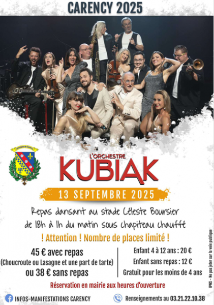 Municipality of Carency (62) is organizing a dinner dance with the KUBIAK orchestra. €45 with meal (Choice of menu: Lasagna or Sauerkraut + slice of pie) €38 show admission Children aged 4 to 12 with meal: €20.00 €20.00 Children's Show Admission Register at the town hall during opening hours. For more information, please call +33 3 21 22 10 38