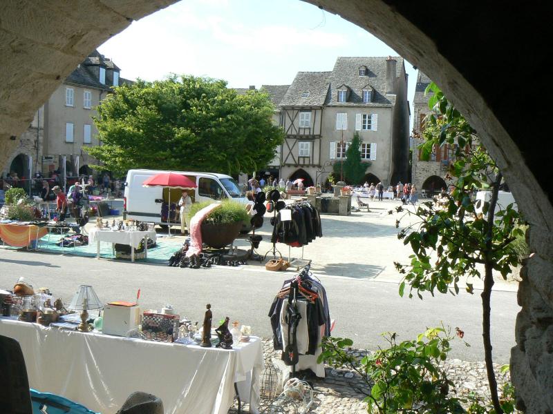 Sauveterre de Rouergue, primarily on the Place des Arcades, whose covered market offers shelter in case of
